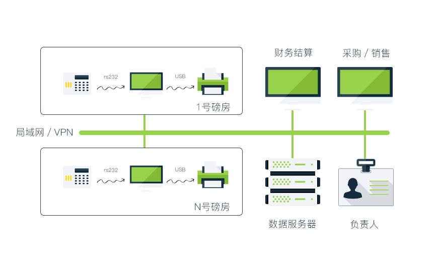 適用場景:一臺或多臺電子汽車衡與一個或多個辦公室聯(lián)網(wǎng),實現(xiàn)數(shù)據(jù)共享;