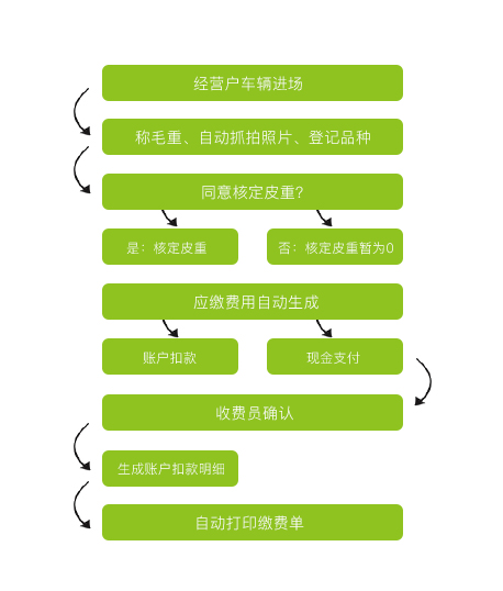 入場收費包括稱重和結(jié)算兩個環(huán)節(jié);進場核定皮重為0時,出場時允許稱重退費。固定經(jīng)營戶自動從賬戶扣款,余額不足時可以現(xiàn)金補齊費用,臨時經(jīng)營戶現(xiàn)金繳費。收費員收齊費用后,確認已收費,系統(tǒng)數(shù)據(jù)提交保存,自動打印入場繳費憑證,車輛憑單入場。
