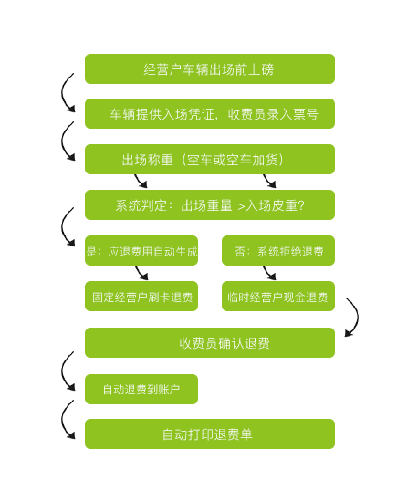 出場退費時,車輛必須提供入場時的進場憑證。出場退費的前提是出場重量大于入場時的皮重(入場皮重可能是核定皮重或是0);收費員確認退費后,系統(tǒng)自動提交數(shù)據(jù),并自動打印退費憑證,車輛可以出場。